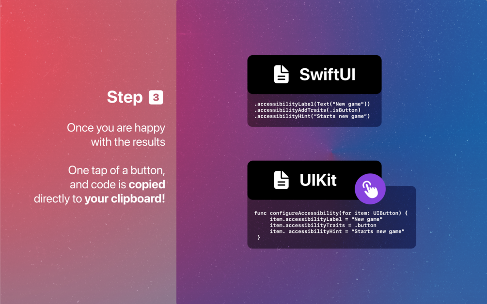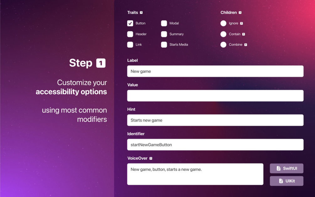 With A11y assistant, you can demo how buttons and other elements would be read by a voiceover and even generate code that you can easily copy/paste into your own project.