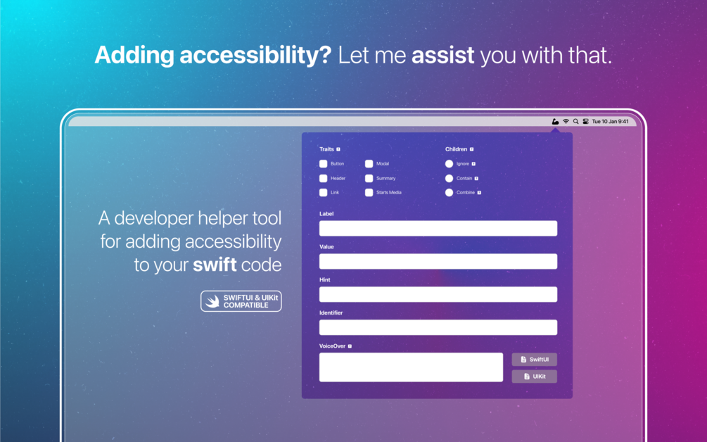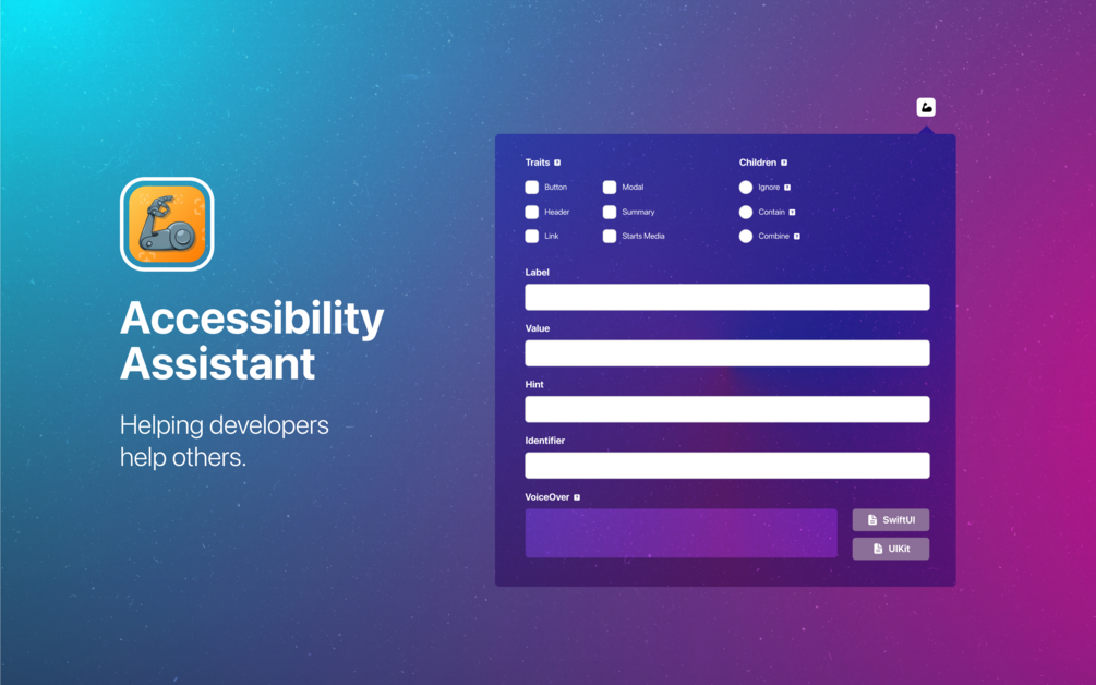Introducing: 🦾 A11y Assistant, the app that makes it easy to create more accessible apps with SwiftUI or UIKit.